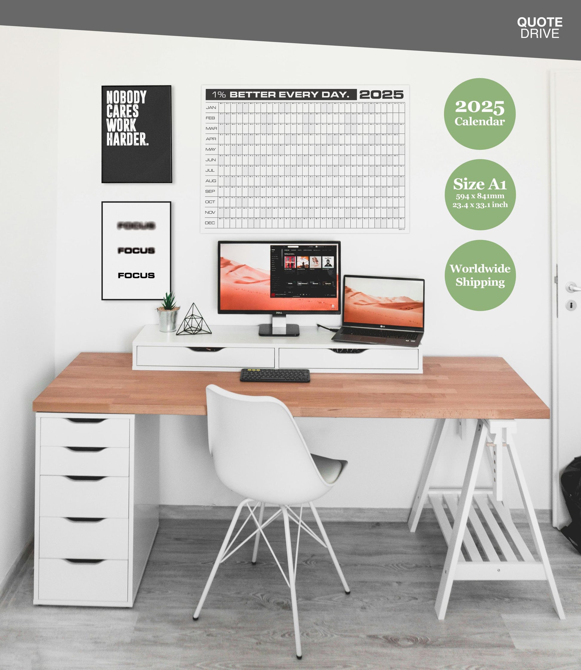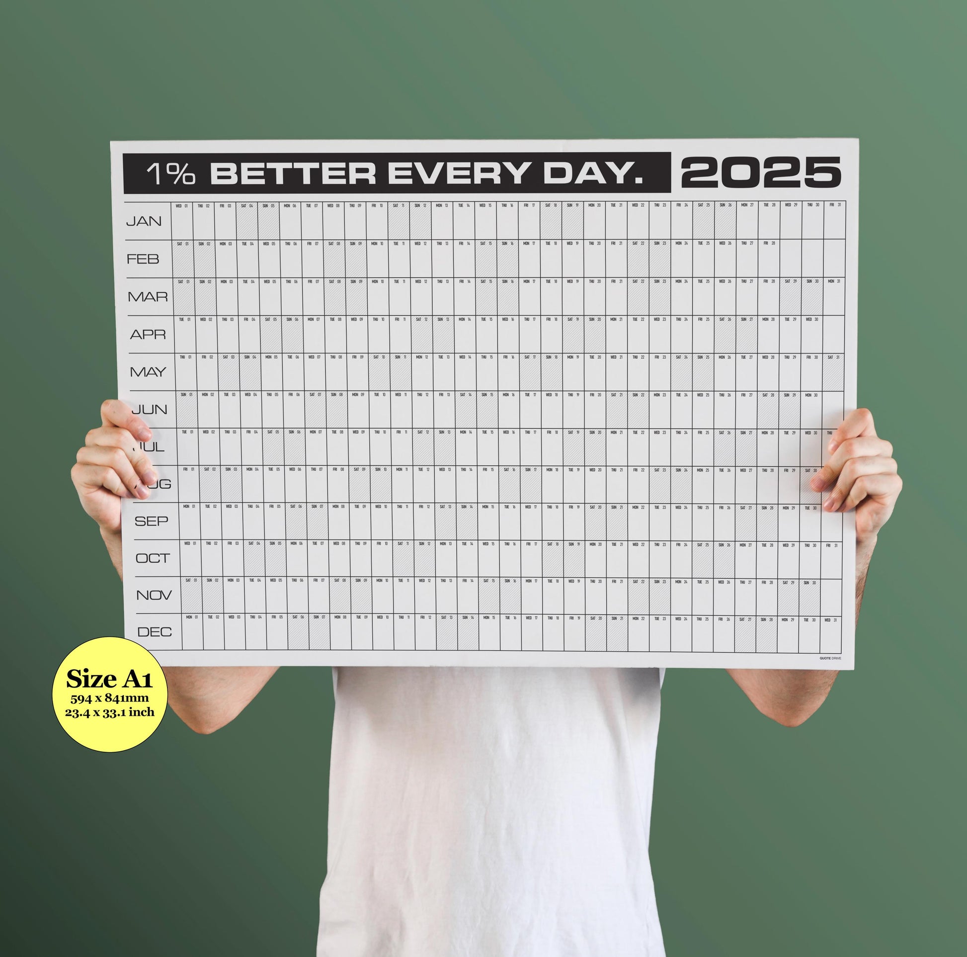 Elevate your planning game with our 2025 Block Year Planner, designed to inspire you to become 1% better every day! This beautifully crafted A1 size planner (59.4 x 84.1 cm | 23.4 x 33.1 inches) is perfect for keeping your year organized and your goals in sight. Whether you're at the office or at home, this planner serves as a daily reminder of your aspirations and helps you track your progress month by month.